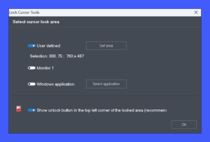 – « Select area and Lock » vous permet de sélectionner la zone dans laquelle vous souhaitez limiter le mouvement du curseur de la souris. Vous pouvez cliquer et faire glisser avec le bouton gauche de la souris pour sélectionner la zone souhaitée ou choisir la zone d’une fenêtre d’application spécifique.